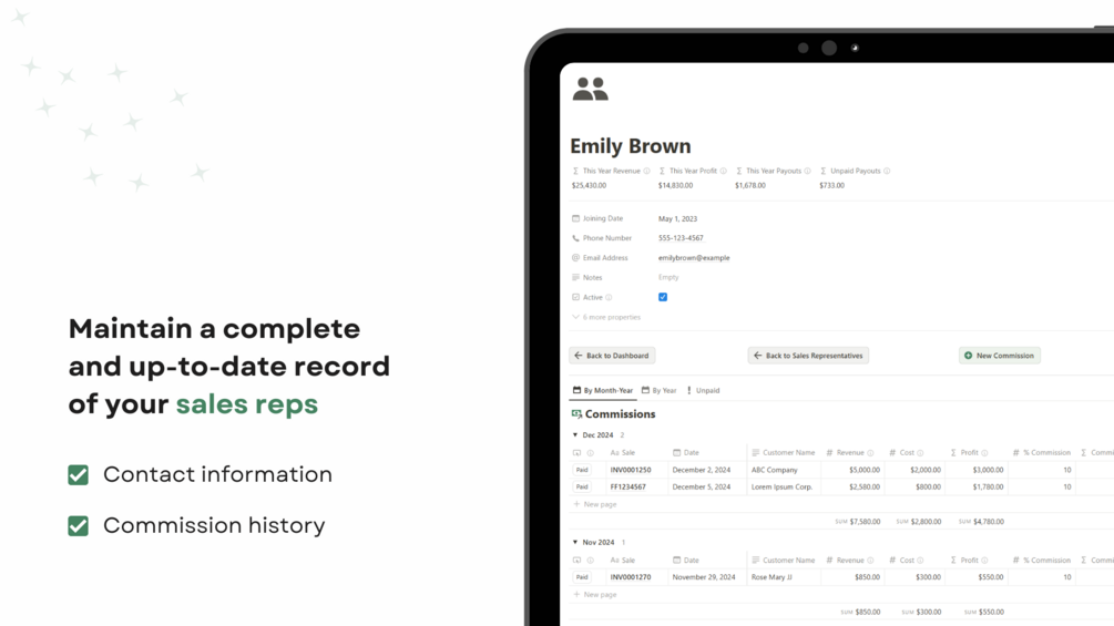 - Sales Representative Database: Easily register your sales representatives with their key information such as name, phone number, email, join date, and more. From the sales representative's page, you can access and manage their commission history.