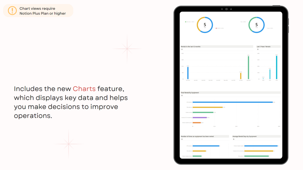 - Includes the new Charts feature, which displays key data and helps you make decisions to improve operations. (This feature requires Notion Plus Plan or higher)