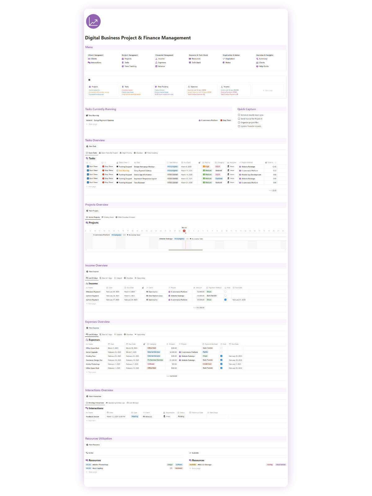 Manage projects, tasks, track time, finances, clients and more in one powerful Notion template. Whether you're a freelancer or an agency, this all-in-one system helps you stay organized, track progress, and streamline your workflow effortlessly. ๐