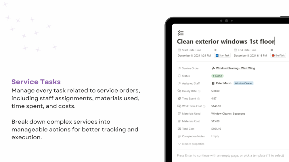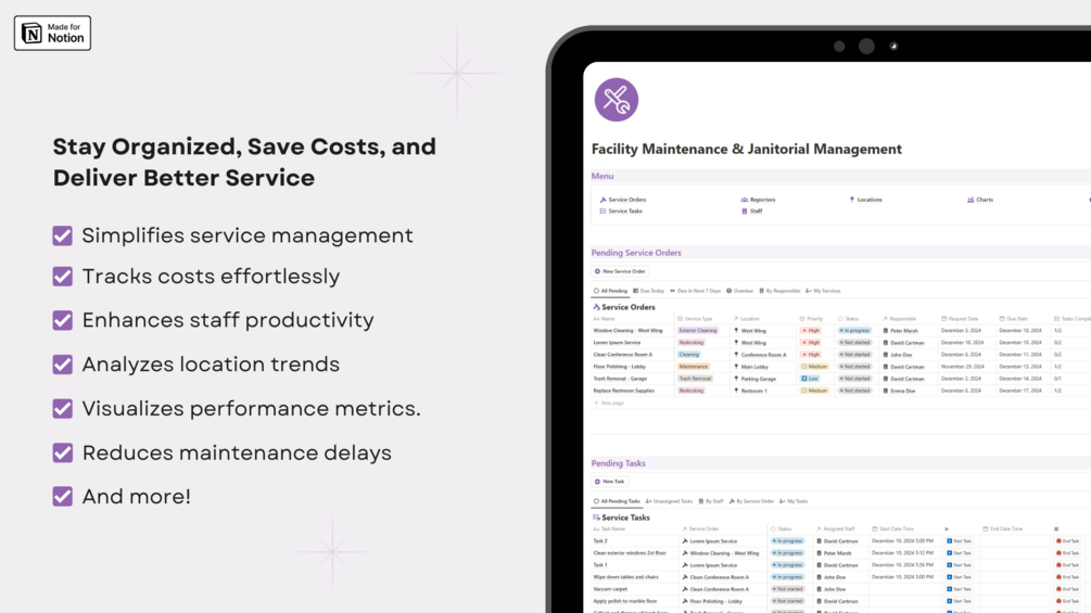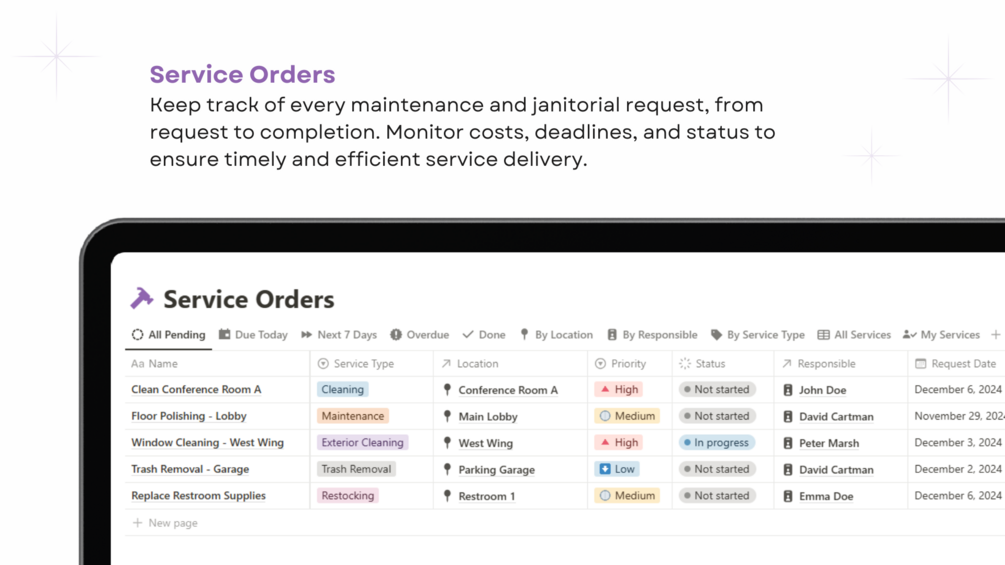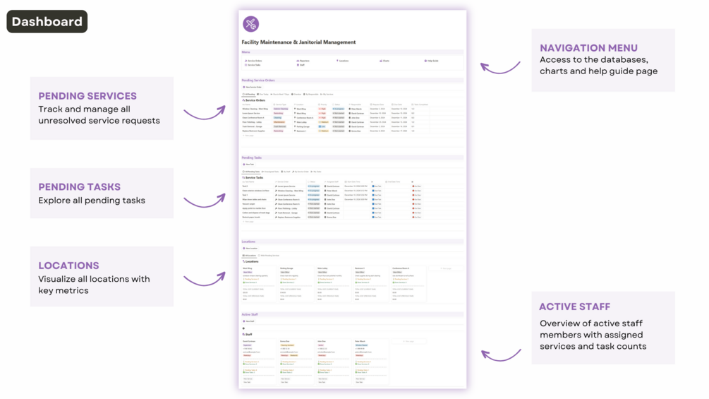 Streamline your facility's maintenance and janitorial operations with this comprehensive Notion template. Streamline service order management, task tracking, cost monitoring, and performance analysis with ease. Ideal for businesses, property managers, and institutions seeking enhanced efficiency and organization.