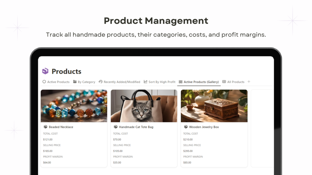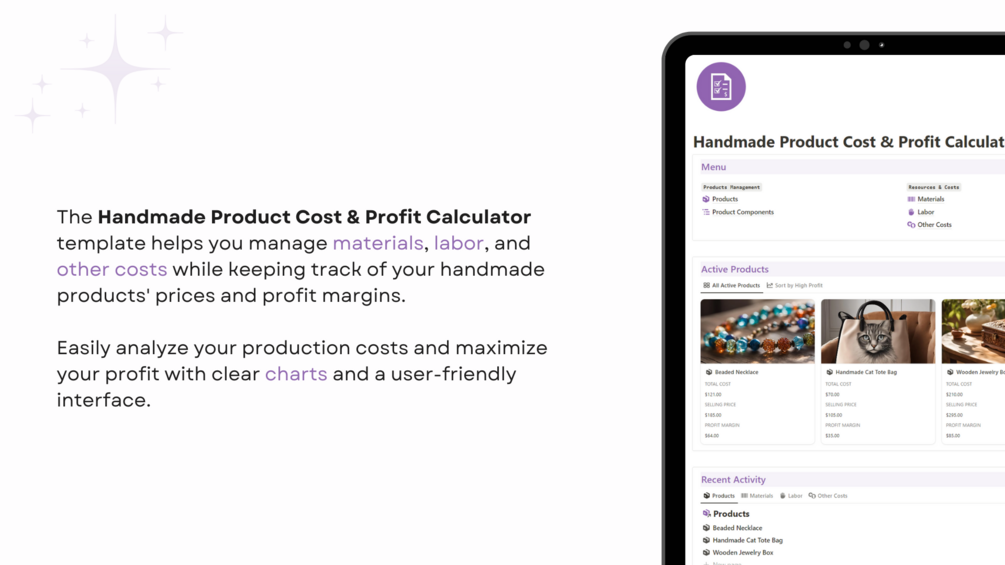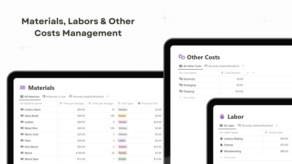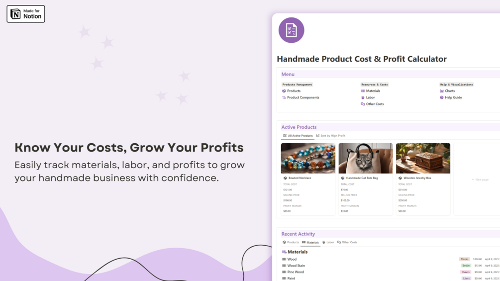 This Notion template helps you track costs, calculate profits, and manage materials, labor, and other costs for your handmade creations. With easy-to-use dashboards and charts, get full visibility into your product costs and profitability.