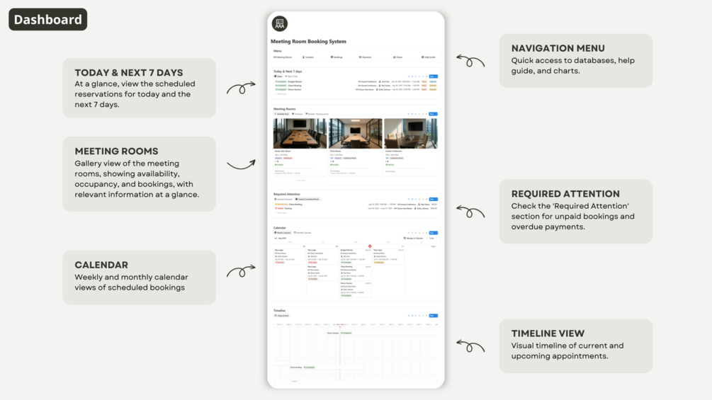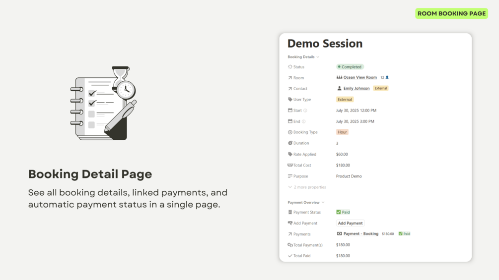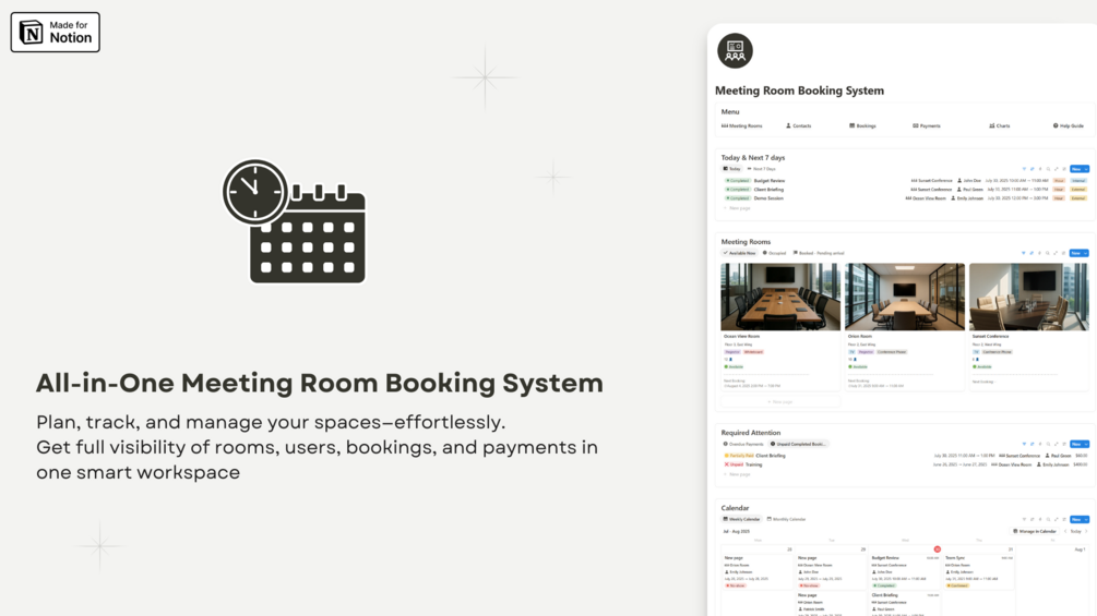 A powerful and flexible Notion template to manage your meeting or conference room bookings—perfect for coworking spaces, teams, or space rentals. Track reservations, assign users, apply internal/external rates, log payments, and visualize everything with built-in dashboards.