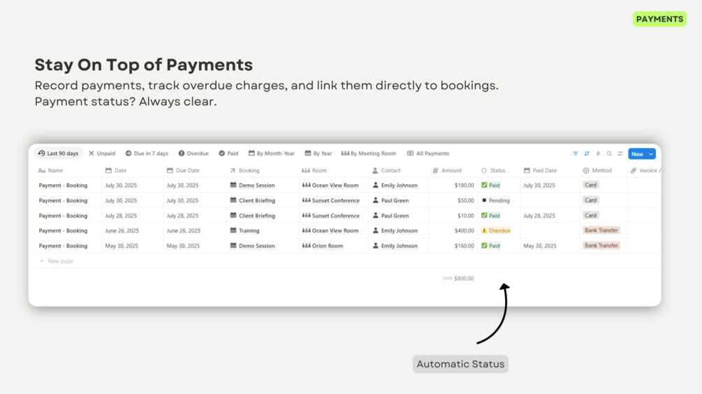 💳 Linked payments with auto totals, unpaid status, and overdue tracking