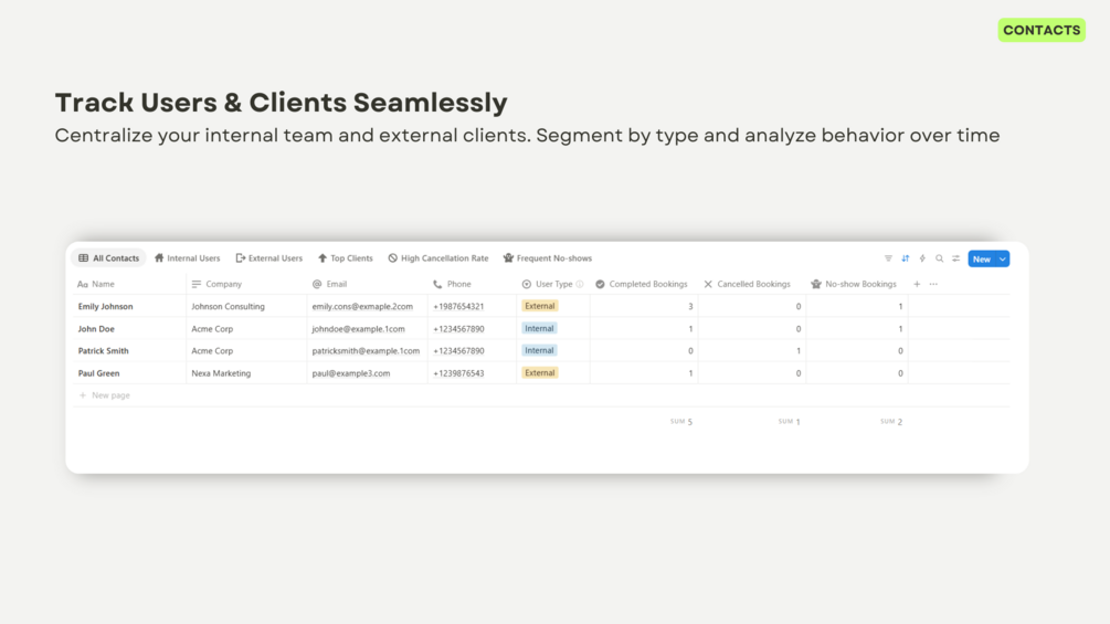 🧑💼 Contact management (internal/external, booking history, no-show tracking)