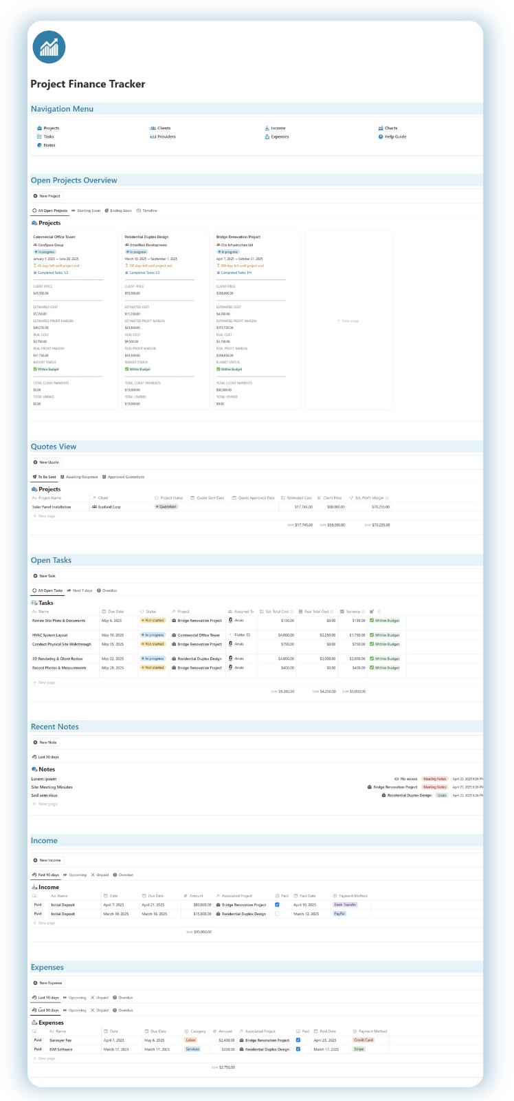 This versatile Notion template lets you manage project budgets, track expenses, record incomes, and calculate real profit margins with ease.