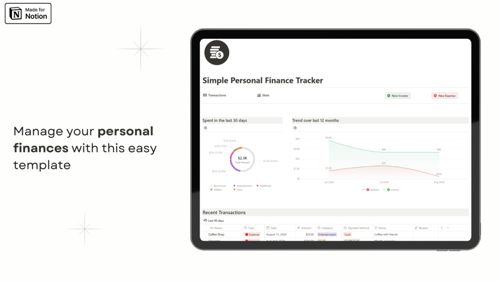 This template makes it easy to manage your personal finances. Track income and expenses, monitor spending, and analyse trends to stay on budget. Ideal for personal use. Includes Notion Charts.