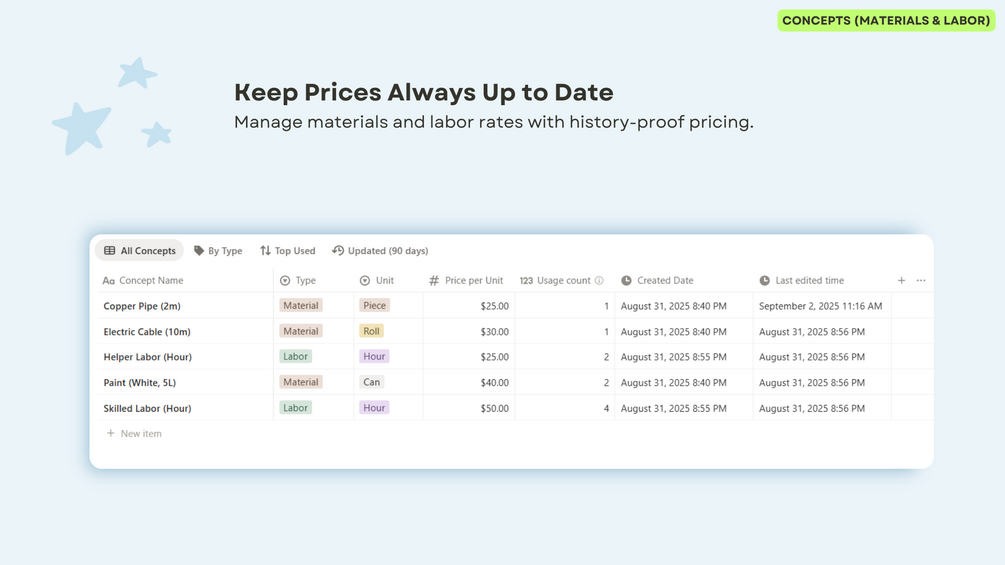 • Concept Catalog: Maintain material and labor prices without affecting past orders.
