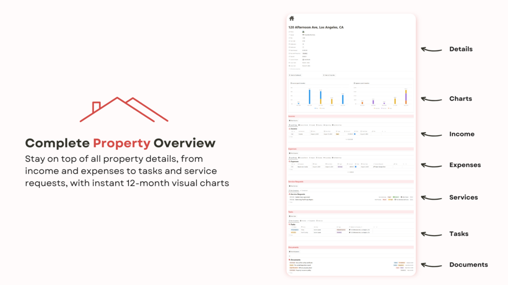 - ๐ Properties: Easily record and store detailed information about your properties, including address, features, rental price, deposit, current tenants, expenses and income history, and more. Keep all the essential details in one convenient location. From the Property page, you can see at a glance the history of income, expenses, service requests and tasks associated with the property.