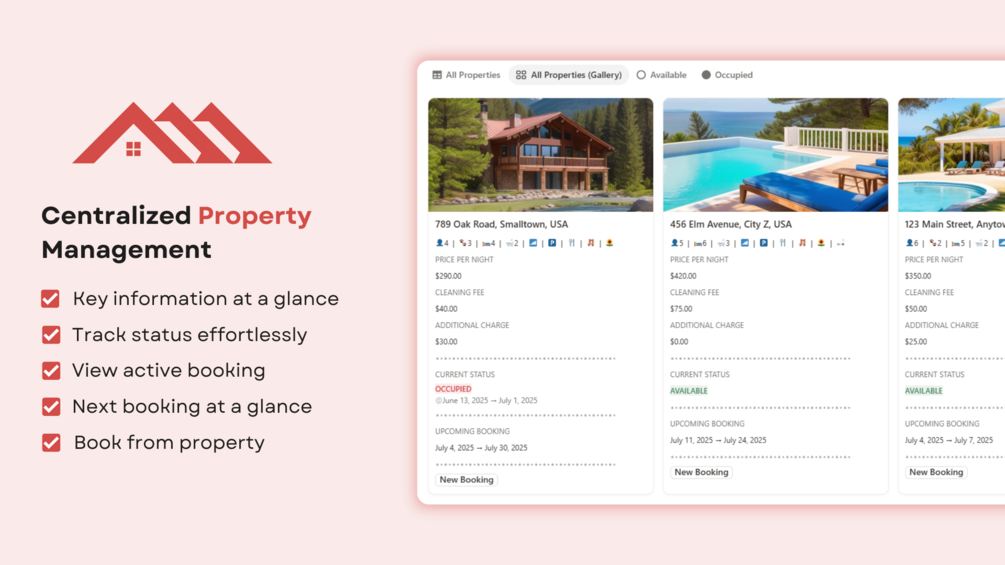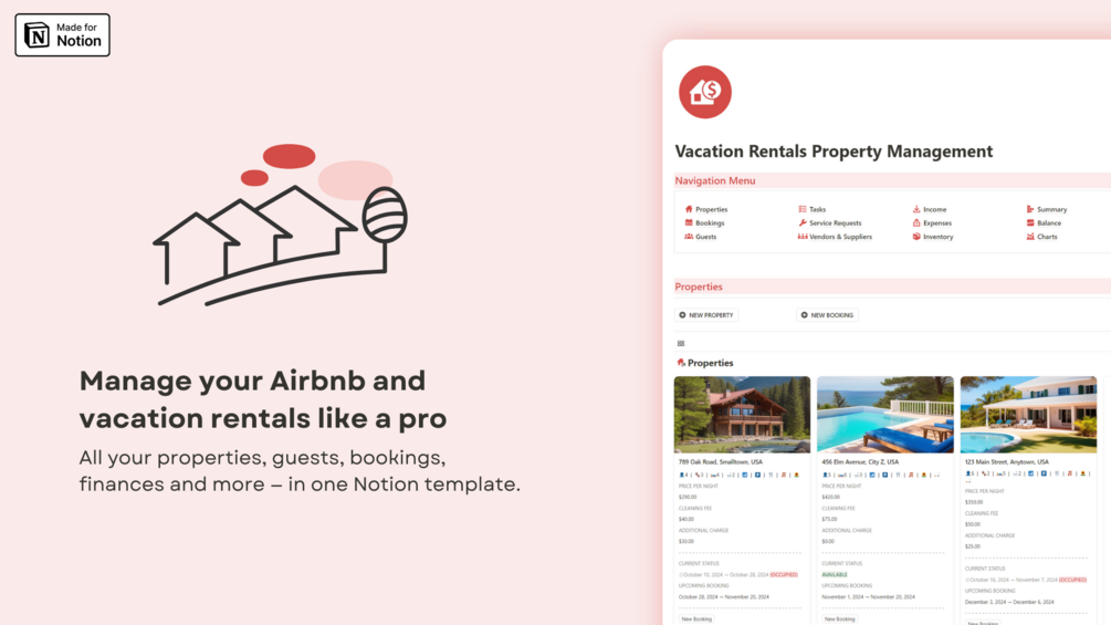 Easily manage vacation and Airbnb rental properties with this Notion template.