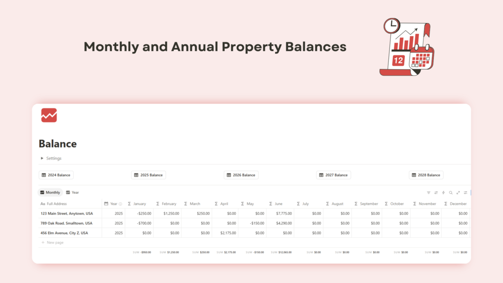 - ๐น Balance: Shows a monthly and yearly balance of all your properties
